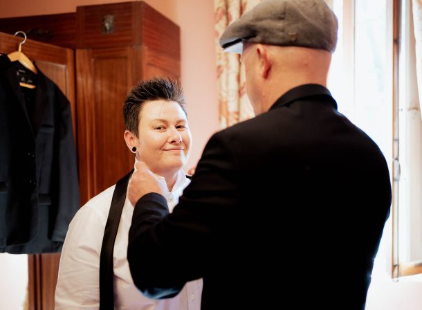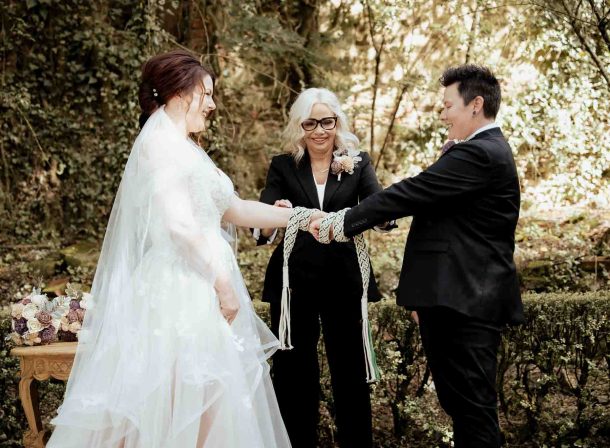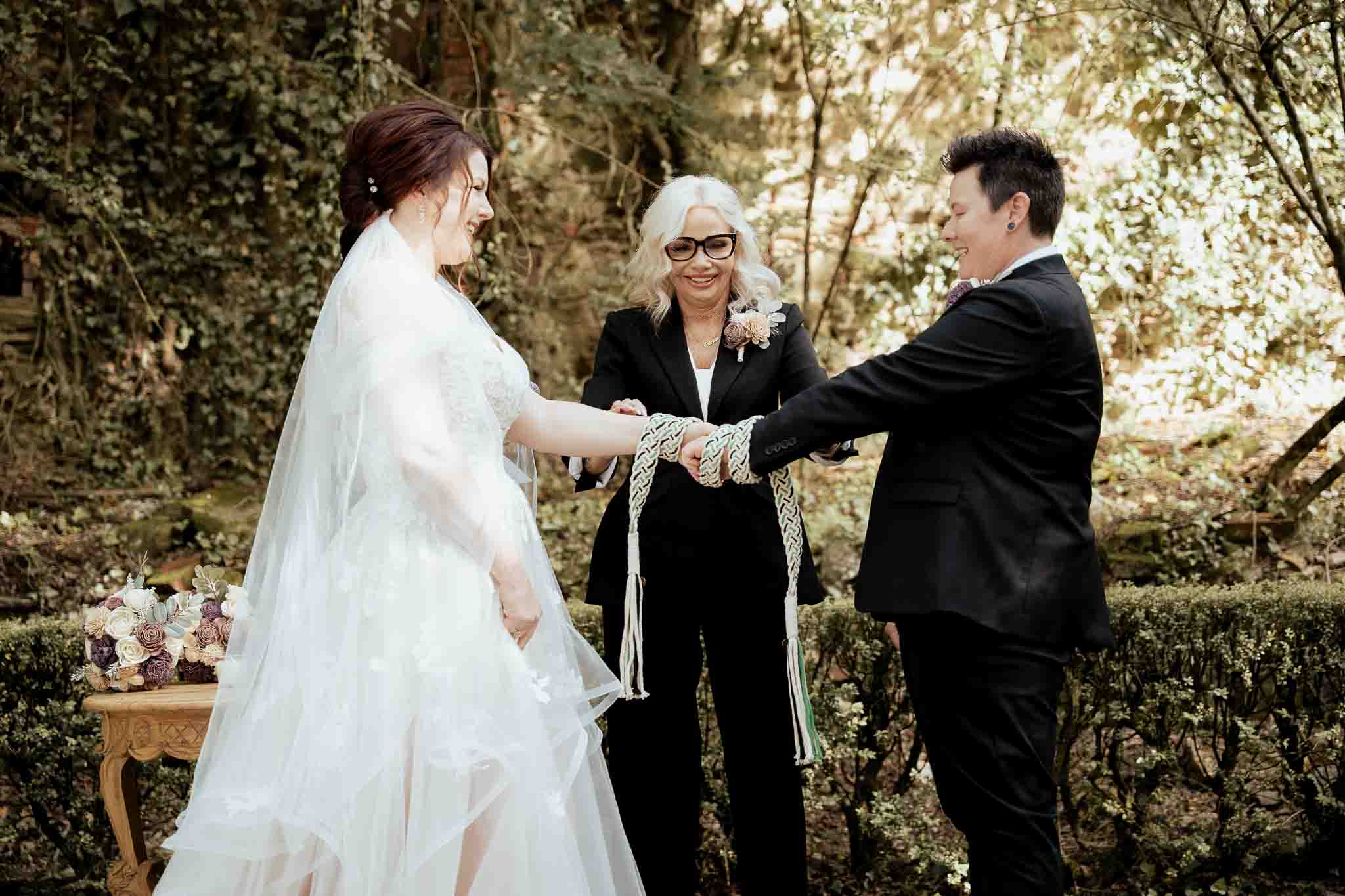 Surrounded by close friends and family, Hannah and Jen exchanged their vows in an atmosphere filled with warmth and genuine emotion. Before exchanging rings, they chose to include a meaningful handfasting ritual, symbolically binding their hands together as a sign of commitment, unity, and trust. A timeless gesture that reflected the depth of their bond and the care with which every moment of the ceremony had been imagined.