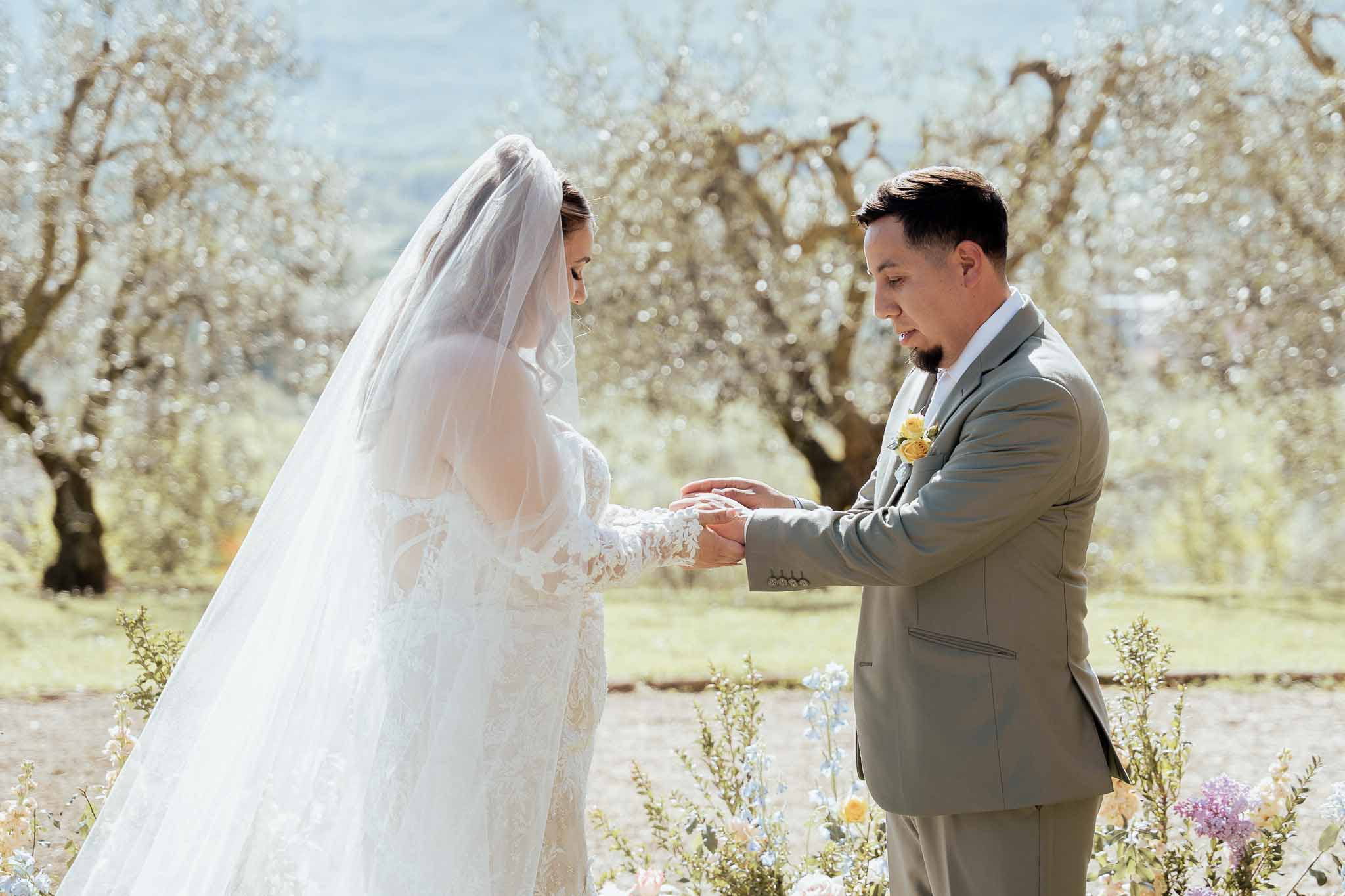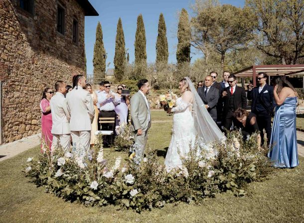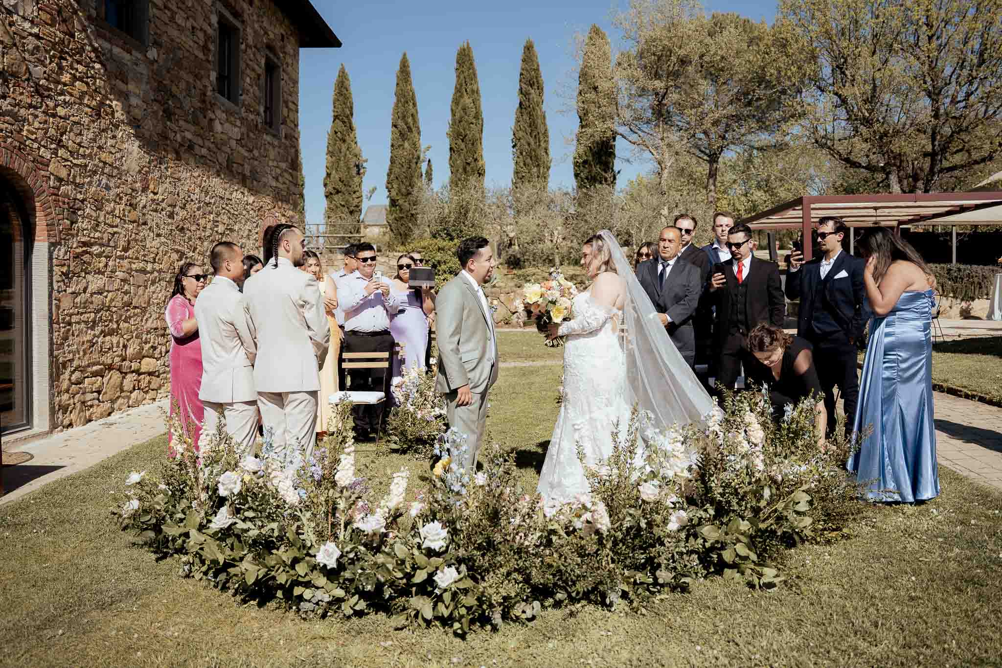 Hilda and Ubaldo’s wedding took place in April 2024, in the garden of Villa Petrea, during an unexpectedly hot spring day. The air was still, the sun generous, and the garden became the setting for an intimate celebration filled with emotion and authenticity.